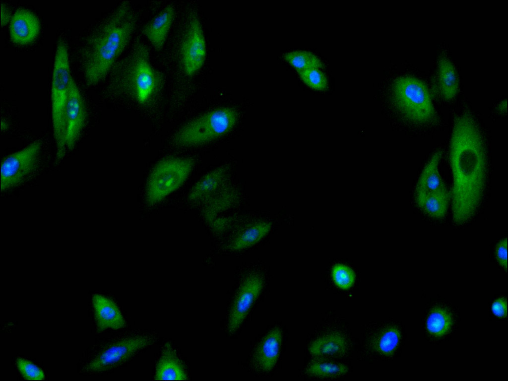 Immunofluorescence staining of A549 cell with CSB-RA152716A0HU at 1:50, counter-stained with DAPI. The cells were fixed in 4% formaldehyde, permeabilized using 0.2% Triton X-100 and blocked in 10% normal Goat Serum. The cells were then incubated with the antibody overnight at 4°C. The secondary antibody was Alexa Fluor 488-congugated AffiniPure Goat Anti-Rabbit IgG(H+L).