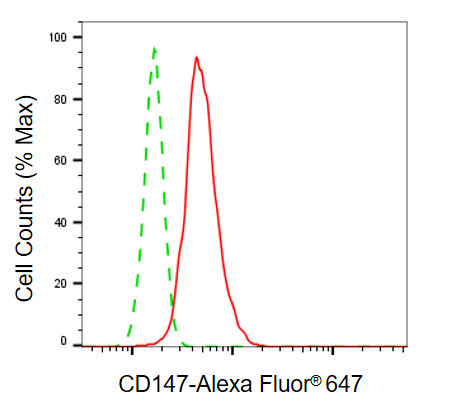 Flow cytometric analysis of CD147 expression in HepG2 cells using CD147 antibody. Green, isotype control; red, CD147.