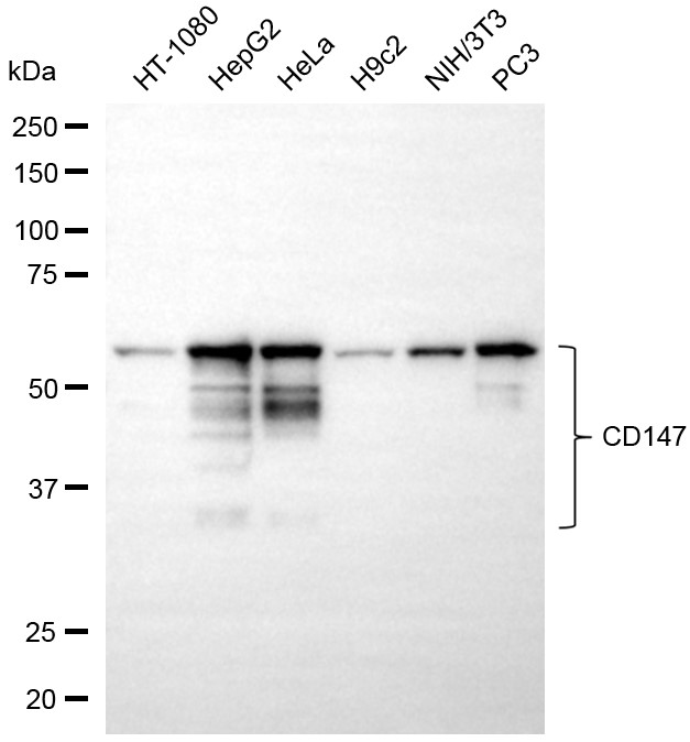 Western blotting analysis using CD147 antibody. Total cell lysates (30 μg) from various cell lines were loaded and separated by SDS-PAGE. The blot was incubated with CD147 antibody and HRP-conjugated goat anti-rabbit secondary antibody respectively.