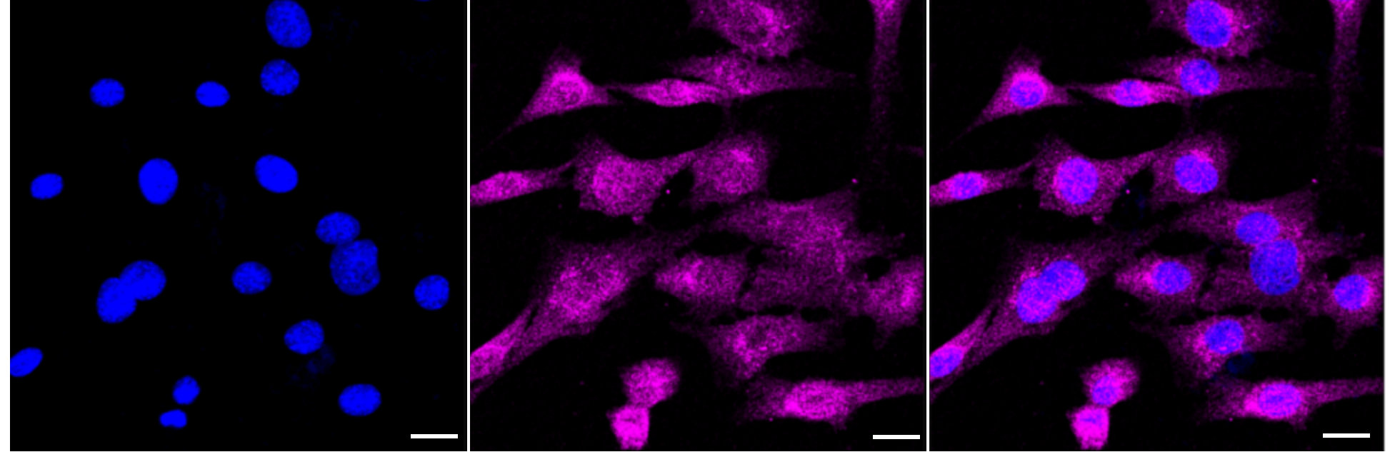 Immunocytochemical staining of C2C12 cells with CAMK2D antibody. Nuclei were stained blue with DAPI; CAMK2D was stained magenta with Alexa Fluor? 647. Images were taken using leica stellaris 5. Protein abundance based on laser intensity and smart gain: Medium. Scale bar: 20 μm.