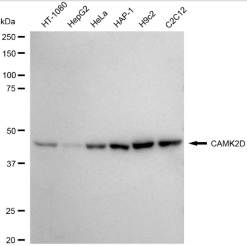 Western blotting analysis using CAMK2D antibody. Total cell lysates (30 μg) from various cell lines were loaded and separated by SDS-PAGE. The blot was incubated with CAMK2D antibody and HRP-conjugated goat anti-rabbit secondary antibody respectively.