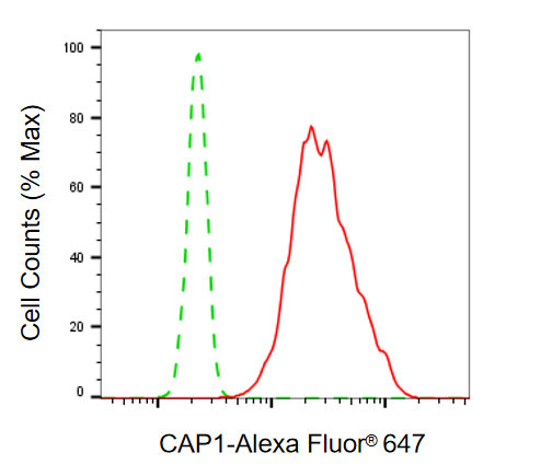 • Flow cytometric analysis of CAP1 expression in HT-1080 cells using CAP1 antibody. Green, isotype control; red, CAP1.