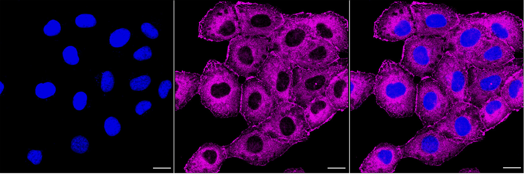 • Immunocytochemical staining of HT-1080 cells with CAP1?antibody. Nuclei were stained blue with DAPI; CAP1 was stained magenta with Alexa Fluor? 647. Images were taken using Leica stellaris 5. Protein abundance based on laser Intensity and smart gain: Medium. Scale bar, 20 μm.