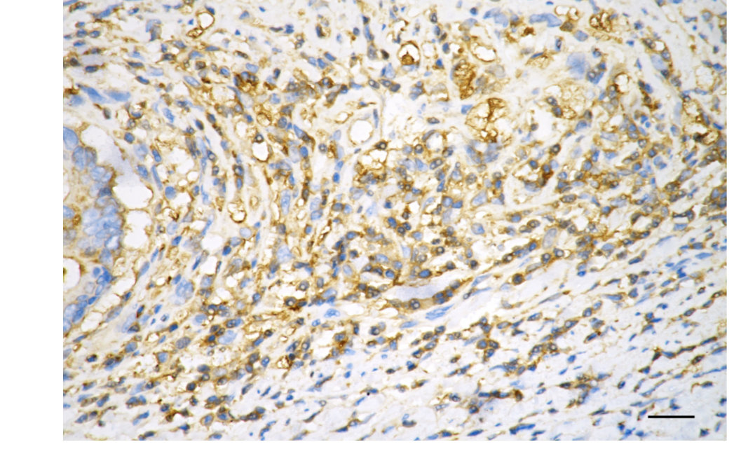 • Immunohistochemistry was performed on paraffin-embedded human sigmoid colon carcinoma using CAP1 antibody. Antigen retrieval was done in sodium citrate buffer (pH 6.0). DAB was used for detection, with hematoxylin counterstaining. Images were acquired using a Nikon Ci-L Plus microscope (40× objective). Scale bar: 25 μm.