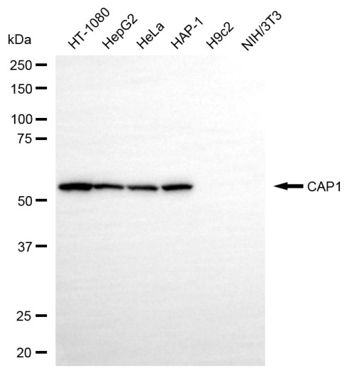 • Western blotting analysis using CAP1 antibody. Total cell lysates (30 μg) from various cell lines were loaded and separated by SDS-PAGE. The blot was incubated with CAP1 antibody and HRP-conjugated goat anti-rabbit secondary antibody respectively.