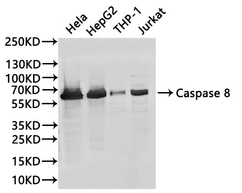, Positive WB detected in:Hela whole cell lysate(30μg), HepG2 whole cell lysate(30μg), THP-1 whole cell lysate(30μg), Jurkat whole cell lysate(30μg)