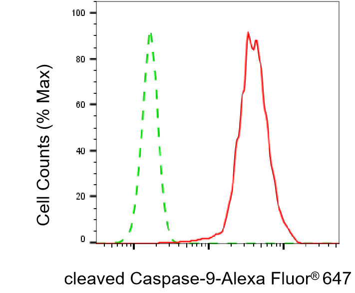 Flow cytometric analysis of cleaved Caspase-9 expression in HepG2 cells using cleaved Caspase-9 antibody. Green, isotype control; red, cleaved Caspase-9.