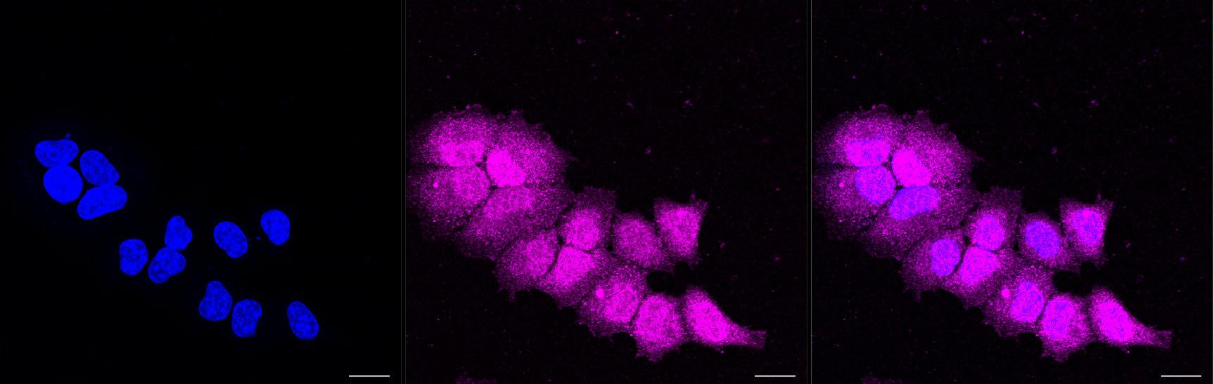 Immunocytochemical staining of HepG2 cells with cleaved Caspase-9 antibody. Nuclei were stained blue with DAPI; cleaved Caspase-9 was stained magenta with Alexa Fluor? 647. Images were taken using Leica stellaris 5. Protein abundance based on laser Intensity and smart gain: Medium. Scale bar, 20 μm.
