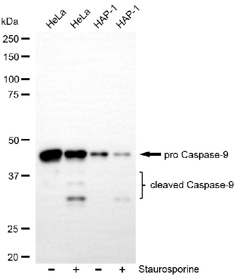 Western blotting analysis using cleaved caspase-9 antibody. Total cell lysates (30 μg) from HeLa and HAP-1 cells untreated or treated with staurosporine (1μM, 3hr) were loaded and separated by SDS-PAGE. The blot was incubated with cleaved caspase-9 antibody and HRP-conjugated goat anti-rabbit secondary antibody respectively.