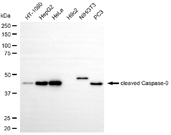 Western blotting analysis using cleaved Caspase-9 antibody. Total cell lysates (30 μg) from various cell lines were loaded and separated by SDS-PAGE. The blot was incubated with cleaved Caspase-9 antibody and HRP-conjugated goat anti-rabbit secondary antibody respectively.
