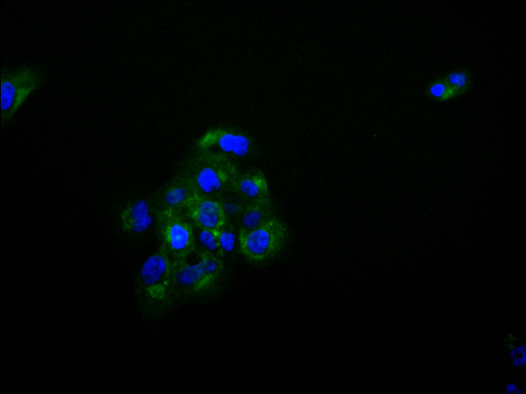 Immunofluorescence staining of A431 cell with CSB-RA789994A0HU at 1:50, counter-stained with DAPI. The cells were fixed in 4% formaldehyde and blocked in 10% normal Goat Serum. The cells were then incubated with the antibody overnight at 4°C. The secondary antibody was Alexa Fluor 488-congugated AffiniPure Goat Anti-Rabbit IgG(H+L).