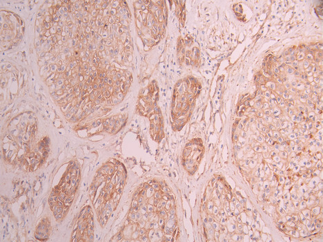IHC image of CSB-RA789994A0HU diluted at 1:100 and staining in paraffin-embedded human pancreatic cancer performed on a Leica BondTM system. After dewaxing and hydration, antigen retrieval was mediated by high pressure in a citrate buffer (pH 6.0). Section was blocked with 10% normal goat serum 30min at RT. Then primary antibody (1% BSA) was incubated at 4°C overnight. The primary is detected by a Goat anti-rabbit polymer IgG labeled by HRP and visualized using 0.05% DAB.