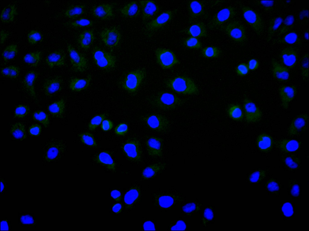 • Immunofluorescence staining of HeLa cell with CSB-RA937256A0HU at 1:50 , counter-stained with DAPI. The cells were fixed in 4% formaldehyde, permeabilized using 0.2% Triton X-100 and blocked in 10% normal Goat Serum. The cells were then incubated with the antibody overnight at 4°C. The secondary antibody was Alexa Fluor 488-congugated AffiniPure Goat Anti-Rabbit IgG(H+L).