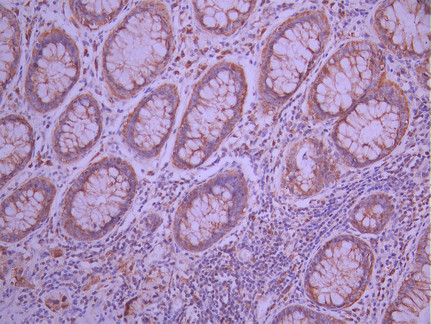 • IHC image of CSB-RA937256A0HU diluted at 1:100 and staining in paraffin-embedded human small intestine tissue performed on a Leica BondTM system. After dewaxing and hydration, antigen retrieval was mediated by high pressure in a citrate buffer (pH 6.0). Section was blocked with 10% normal goat serum 30min at RT. Then primary antibody (1% BSA) was incubated at 4°C overnight. The primary is detected by a Goat anti-rabbit polymer IgG labeled by HRP and visualized using 0.05% DAB.
