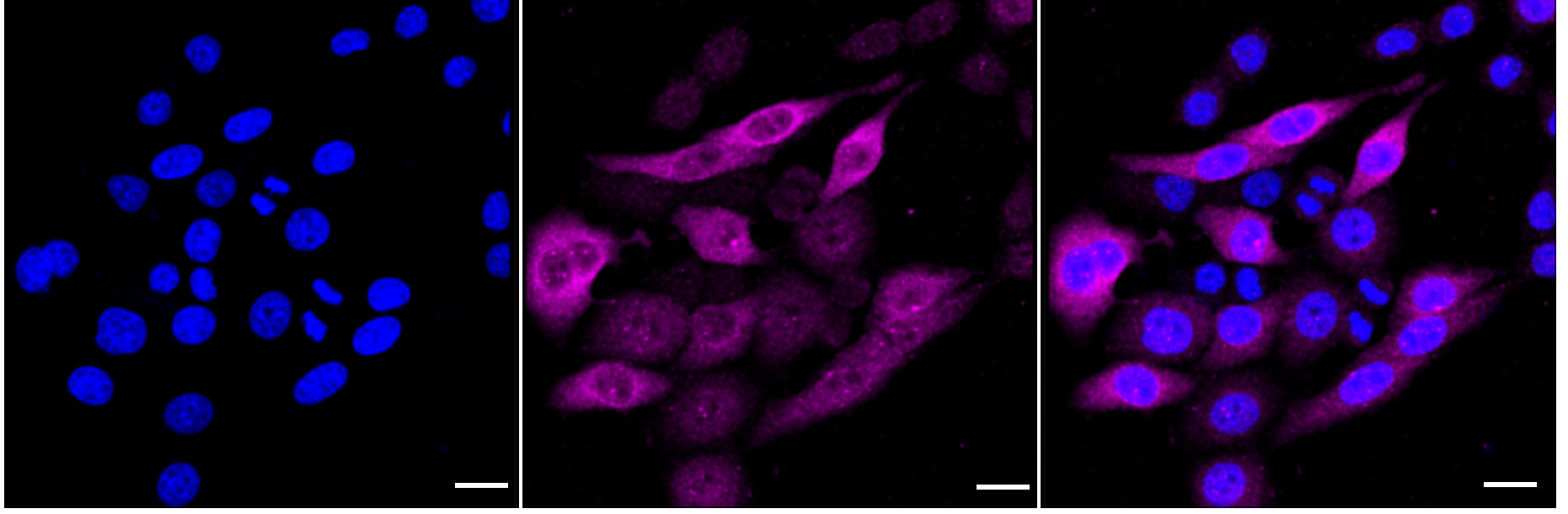 Immunocytochemical staining of HepG2 cells with Cyclin B2 antibody. Nuclei were stained blue with DAPI; Cyclin B2 was stained magenta with Alexa Fluor? 647. Images were taken using Leica stellaris 5. Protein abundance based on laser Intensity and smart gain: Medium. Scale bar: 20 μm.