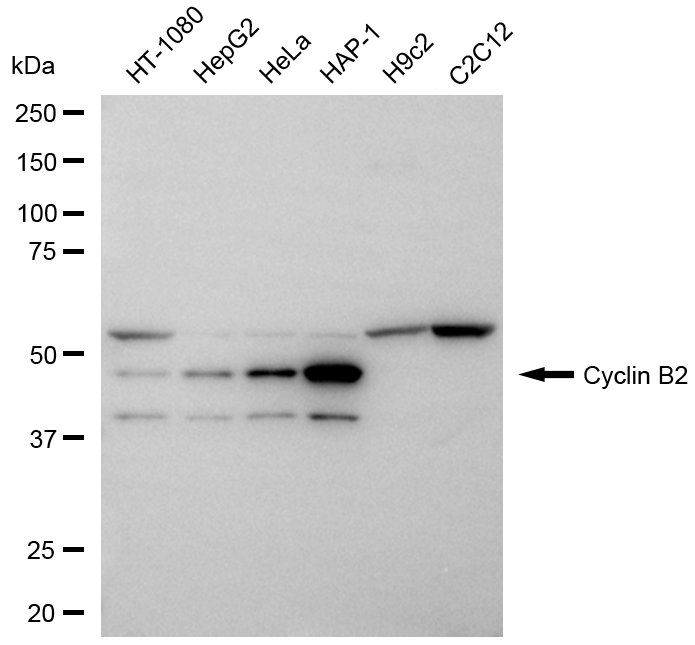 Western blotting analysis using Cyclin B2 antibody. Total cell lysates (30 μg) from various cell lines were loaded and separated by SDS-PAGE. The blot was incubated with Cyclin B2 antibody and HRP-conjugated goat anti-rabbit secondary antibody respectively.