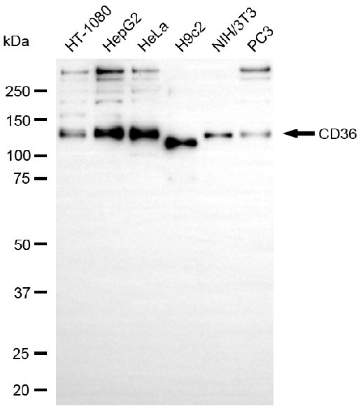 Western blotting analysis using CD36 antibody. Total cell lysates (30 μg) from various cell lines were loaded and separated by SDS-PAGE. The blot was incubated with CD36 antibody and HRP-conjugated goat anti-rabbit secondary antibody respectively.