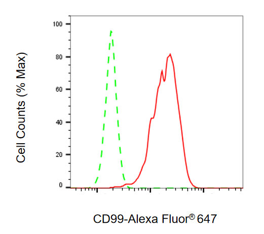 Flow cytometric analysis of CD99 expression in HepG2 cells using CD99 antibody. Green, isotype control; red, CD99.