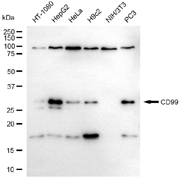 Western blotting analysis using CD99 antibody. Total cell lysates (30 μg) from various cell lines were loaded and separated by SDS-PAGE. The blot was incubated with CD99 antibody and HRP-conjugated goat anti-rabbit secondary antibody respectively.