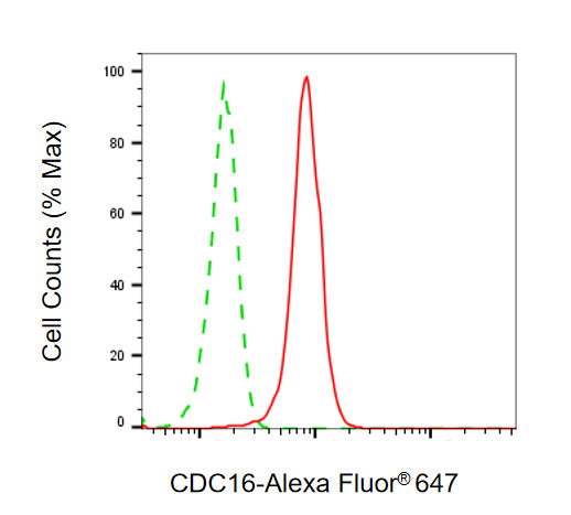 Flow cytometric analysis of CDC16 expression in HeLa cells using CDC16 antibody. Green, isotype control; red, CDC16.