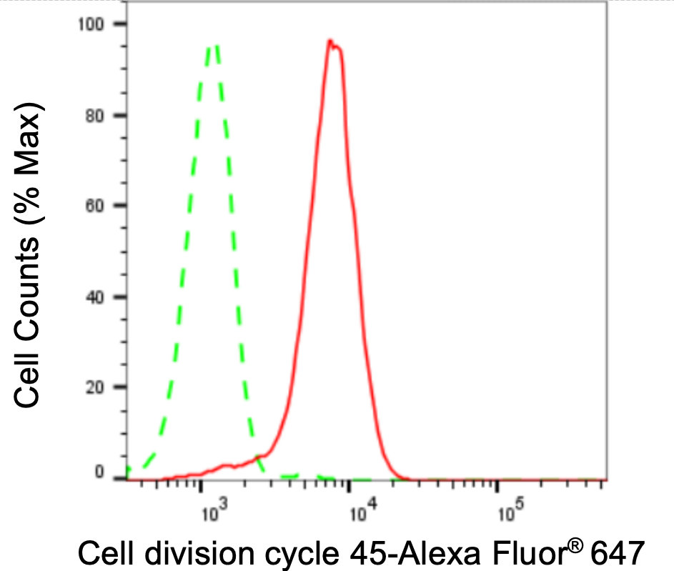 • Flow cytometric analysis of Cell division cycle 45 expression in HepG2 cells using Cell division cycle 45 antibody. Green, isotype control; red, Cell division cycle 45.