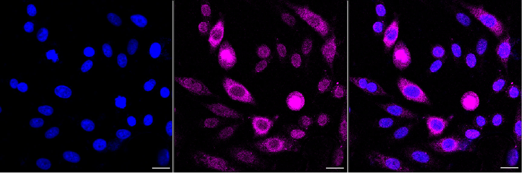 Immunocytochemical staining of HepG2 cells with Phospho-CDC6 (Ser106) antibody. Nuclei were stained blue with DAPI; Phospho-CDC6 (Ser106) was stained magenta with Alexa Fluor? 647. Images were taken using Leica stellaris 5. Protein abundance based on laser Intensity and smart gain: Medium. Scale bar, 20 μm.