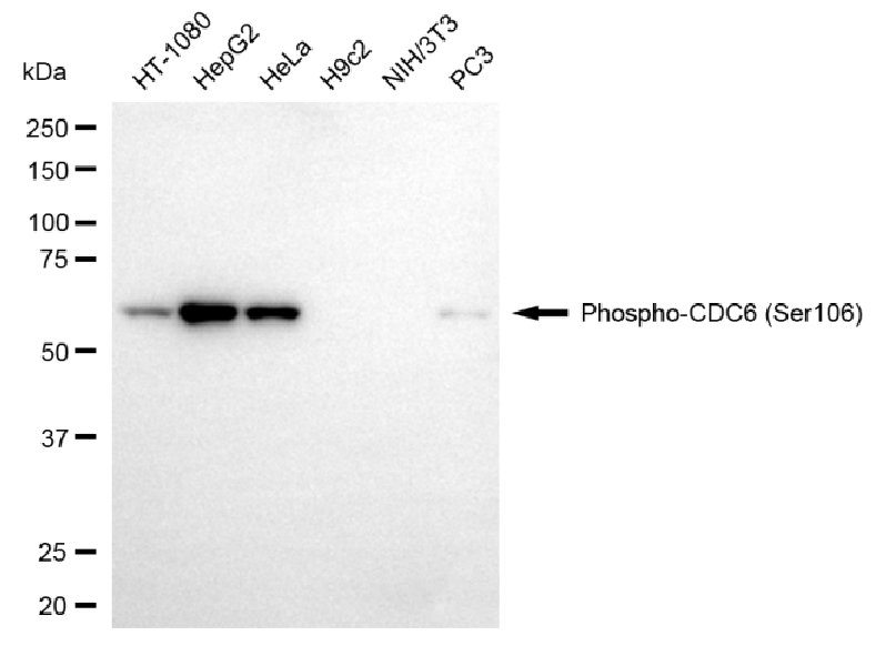 Western blotting analysis using phospho-CDC6 (Ser106) antibody. Total cell lysates (30 μg) from various cell lines were loaded and separated by SDS-PAGE. The blot was incubated with phospho-CDC6 (Ser106) antibody and HRP-conjugated goat anti-rabbit secondary antibody respectively.