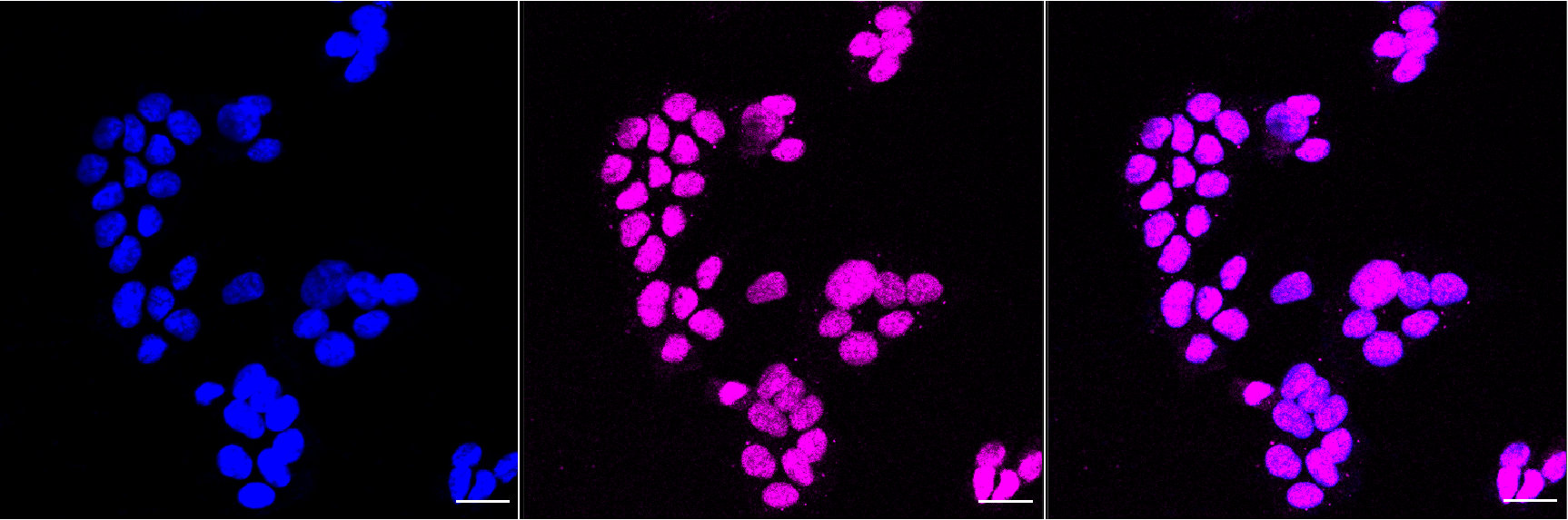 Immunocytochemical staining of HAP-1 cells with Cyclin dependent kinase inhibitor 1B antibody. Nuclei were stained blue with DAPI; Cyclin dependent kinase inhibitor 1B was stained magenta with Alexa Fluor? 647. Images were taken using Leica stellaris 5. Protein abundance based on laser Intensity and smart gain: Medium. Scale bar, 20 μm.
