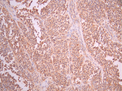 IHC image of CSB-RA131135A0HU diluted at 1:100 and staining in paraffin-embedded human liver cancer performed on a Leica BondTM system. After dewaxing and hydration, antigen retrieval was mediated by high pressure in a citrate buffer (pH 6.0). Section was blocked with 10% normal goat serum 30min at RT. Then primary antibody (1% BSA) was incubated at 4°C overnight. The primary is detected by a Goat anti-rabbit polymer IgG labeled by HRP and visualized using 0.05% DAB.