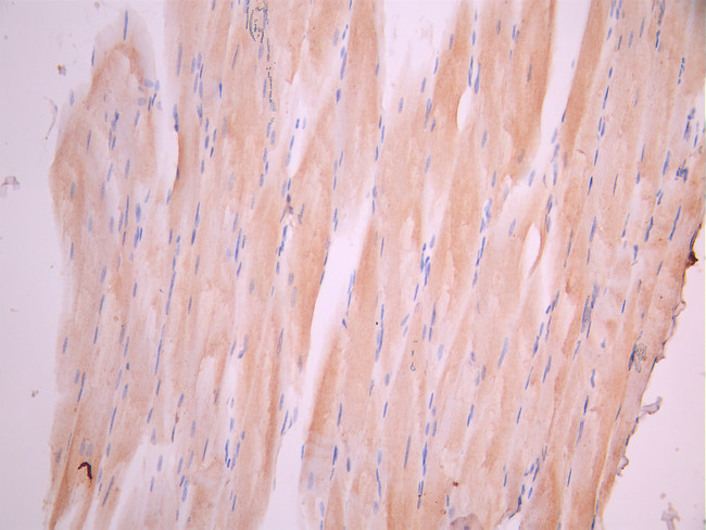 IHC image of CSB-RA005386MA1HU diluted at 1:50 and staining in paraffin-embedded human skeletal muscle tissue performed on a Leica BondTM system. After dewaxing and hydration, antigen retrieval was mediated by high pressure in a citrate buffer (pH 6.0). Section was blocked with 10% normal goat serum 30min at RT. Then primary antibody (1% BSA) was incubated at 4°C overnight. The primary is detected by a Anti-Human lgG, Fcy Fragment Specific labeled by HRP and visualized using 0.05% DAB.