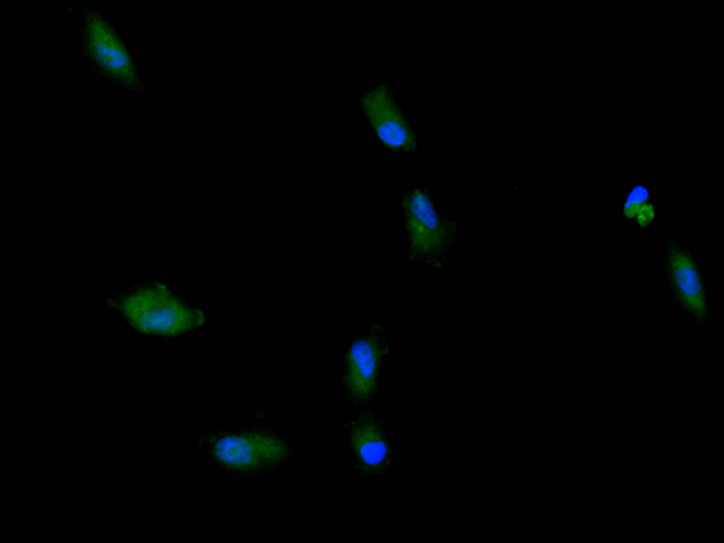 Immunofluorescence staining of Hela cell with CSB-RA005595MA2HU at 1:30 ,counter-stained with DAPI. The cells were fixed in 4% formaldehyde, permeabilized using 0.2% Triton X-100 and blocked in 10% normal Goat Serum. The cells were then incubated with the antibody overnight at 4°C. The secondary antibody was Alexa Fluor 488-congugated AffiniPure Goat Anti-Human IgG(H+L).
