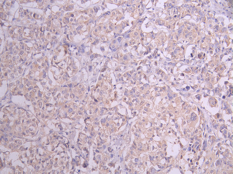 IHC image of CSB-RA005595MA2HU diluted at 1:50 and staining in paraffin-embedded human breast cancer performed on a Leica BondTM system. After dewaxing and hydration, antigen retrieval was mediated by high pressure in a citrate buffer (pH 6.0). Section was blocked with 10% normal goat serum 30min at RT. Then primary antibody (1% BSA) was incubated at 4°C overnight. The primary is detected by a Anti-Human lgG, Fcy Fragment Specific labeled by HRP and visualized using 0.05% DAB.