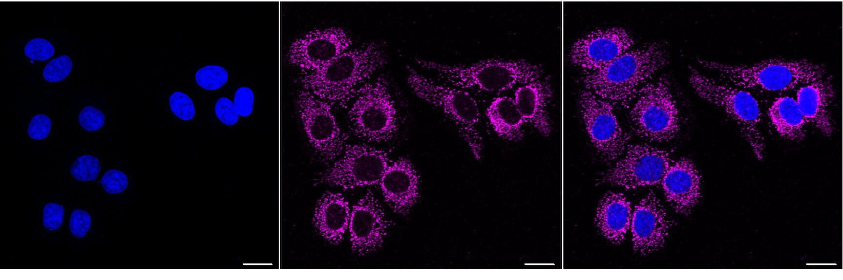 Immunocytochemical staining of HepG2 cells with COXIV antibody. Nuclei were stained blue with DAPI; COXIV was stained magenta with Alexa Fluor? 647.Images were taken using Leica stellaris 5. Protein abundance based on laser Intensity and smart gain: Medium. Scale bar, 20 μm.