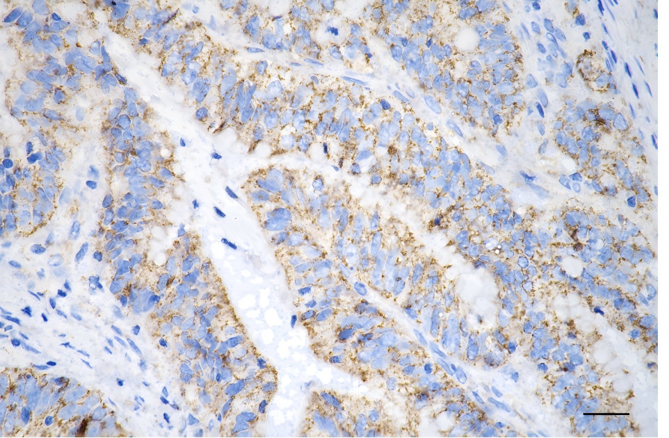Immunohistochemistry was performed on paraffin-embedded human sigmoid colon carcinoma using COXIV antibody. Antigen retrieval was done in sodium citrate buffer (pH 6.0). DAB was used for detection, with hematoxylin counterstaining. Images were acquired using a Nikon Ci-L Plus microscope (40× objective). Scale bar: 25 μm.