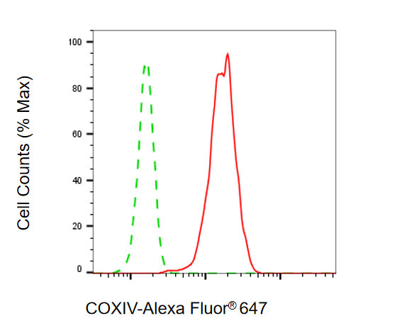 Flow cytometric analysis of COXIV expression in HepG2 cells using COXIV antibody. Green, isotype control; red, COXIV.