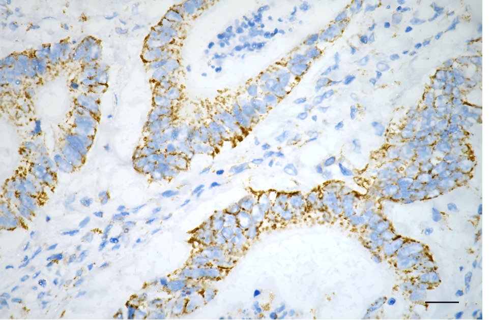 Immunohistochemistry was performed on paraffin-embedded human sigmoid colon carcinoma using COXIV antibody. Antigen retrieval was done in sodium citrate buffer (pH 6.0). DAB was used for detection, with hematoxylin counterstaining. Images were acquired using a Nikon Ci-L Plus microscope (40× objective). Scale bar: 25 μm.