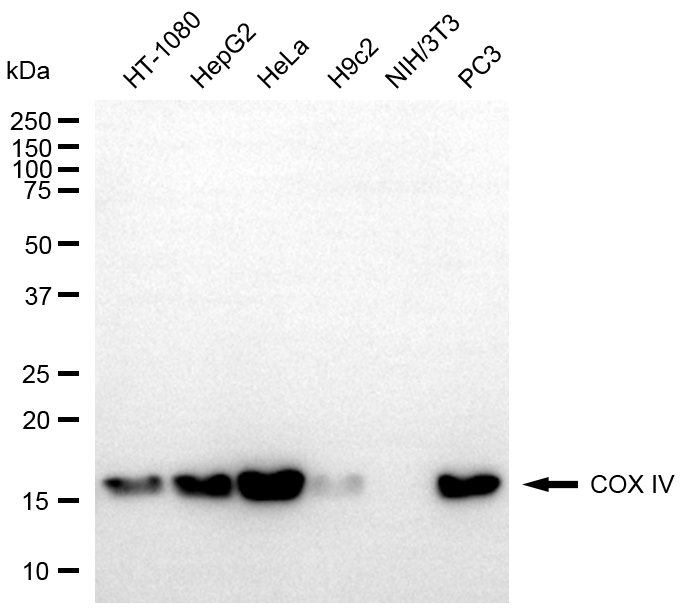 Western blotting analysis using COXIV antibody. Total cell lysates (30 μg) from various cell lines were loaded and separated by SDS-PAGE. The blot was incubated with COXIV antibody and HRP-conjugated goat anti-rabbit secondary antibody respectively.