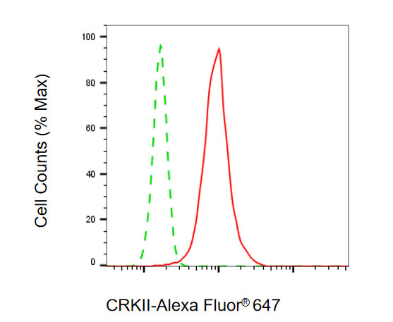 Flow cytometric analysis of CRKII expression in HepG2 cells using CRKII antibody. Green, isotype control; red, CRKII.