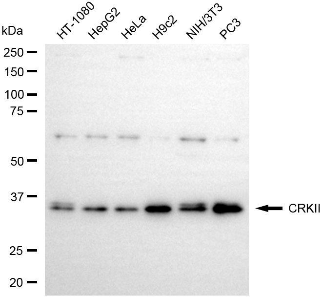 Western blotting analysis using CRKII antibody. Total cell lysates (30 μg) from various cell lines were loaded and separated by SDS-PAGE. The blot was incubated with CRKII antibody and HRP-conjugated goat anti-rabbit secondary antibody respectively.