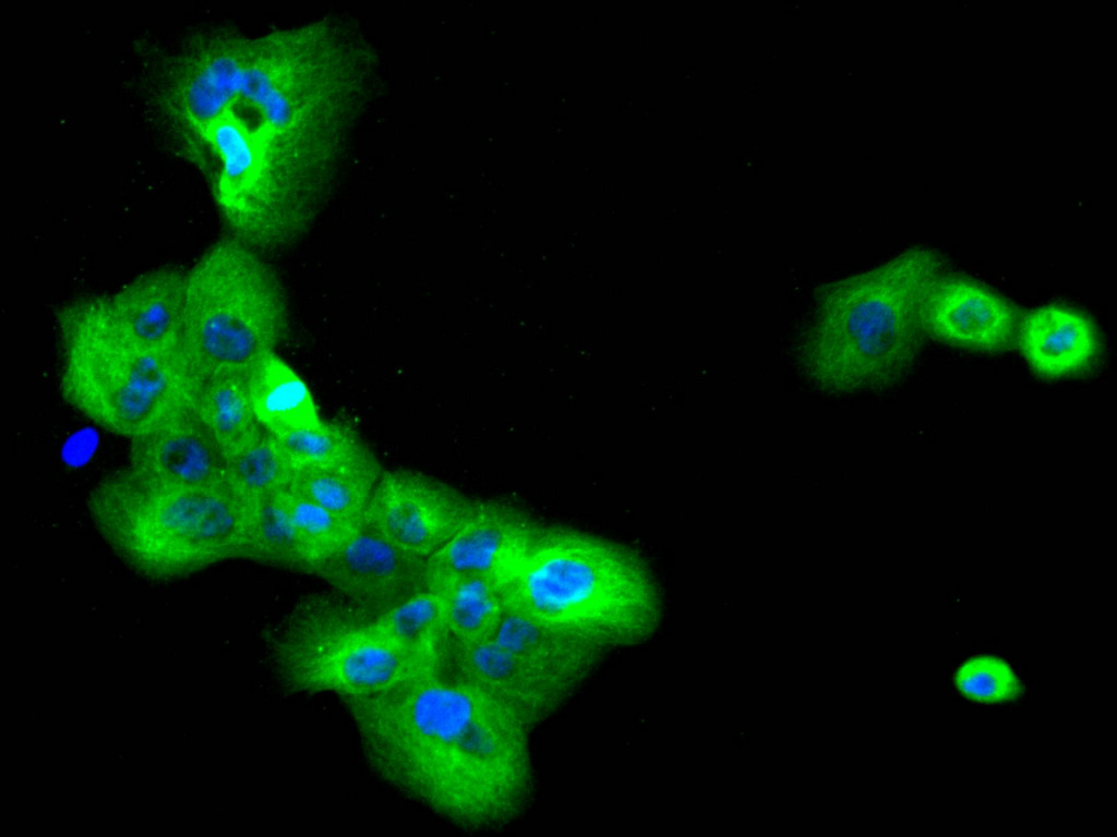• Immunofluorescence staining of A431 cell with CSB-RA901089A0HU at 1:50, counter-stained with DAPI. The cells were fixed in 4% formaldehyde, permeabilized using 0.2% Triton X-100 and blocked in 10% normal Goat Serum. The cells were then incubated with the antibody overnight at 4°C. The secondary antibody was Alexa Fluor 488-congugated AffiniPure Goat Anti-Rabbit IgG(H+L).