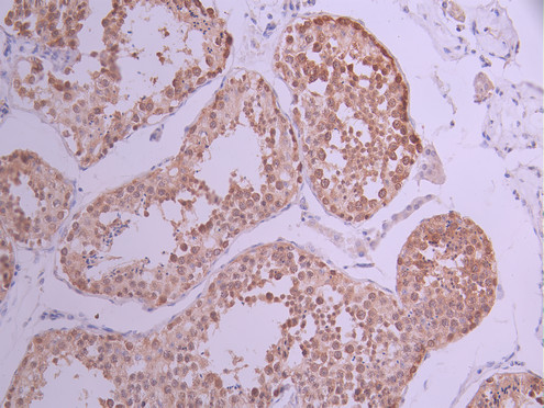 • IHC image of CSB-RA901089A0HU diluted at 1:100 and staining in paraffin-embedded human testis tissue performed on a Leica BondTM system. After dewaxing and hydration, antigen retrieval was mediated by high pressure in a citrate buffer (pH 6.0). Section was blocked with 10% normal goat serum 30min at RT. Then primary antibody (1% BSA) was incubated at 4°C overnight. The primary is detected by a Goat anti-rabbit polymer IgG labeled by HRP and visualized using 0.05% DAB.