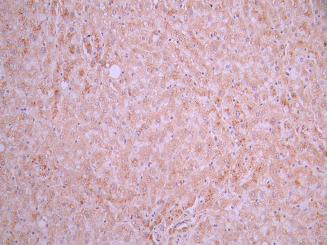IHC image of CSB-RA006243MA1HU diluted at 1:50 and staining in paraffin-embedded human liver tissue performed on a Leica BondTM system. After dewaxing and hydration, antigen retrieval was mediated by high pressure in a citrate buffer (pH 6.0). Section was blocked with 10% normal goat serum 30min at RT. Then primary antibody (1% BSA) was incubated at 4°C overnight. The primary is detected by a Anti-Human lgG, Fcy Fragment Specific labeled by HRP and visualized using 0.05% DAB.