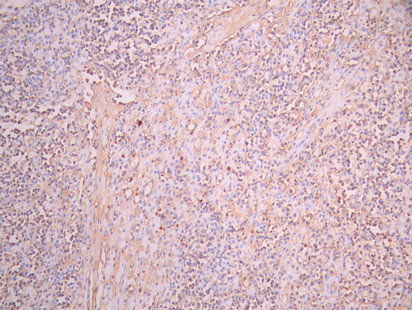 IHC image of CSB-RA006243MA1HU diluted at 1:50 and staining in paraffin-embedded human lymph node tissue performed on a Leica BondTM system. After dewaxing and hydration, antigen retrieval was mediated by high pressure in a citrate buffer (pH 6.0). Section was blocked with 10% normal goat serum 30min at RT. Then primary antibody (1% BSA) was incubated at 4°C overnight. The primary is detected by a Anti-Human lgG, Fcy Fragment Specific labeled by HRP and visualized using 0.05% DAB.