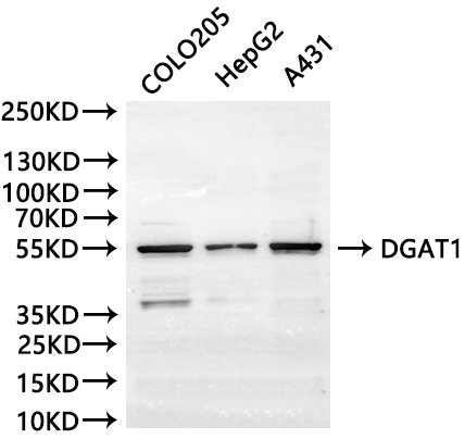 , Positive WB detected in:COLO205 whole cell lysate(30μg), HepG2 whole cell lysate(30μg), A431 whole cell lysate(30μg)