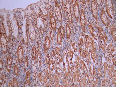 IHC image of CSB-RA080723A0HU diluted at 1:100 and staining in paraffin-embedded human stomach tissue performed on a Leica BondTM system. After dewaxing and hydration, antigen retrieval was mediated by high pressure in a citrate buffer (pH 6.0). Section was blocked with 10% normal goat serum 30min at RT. Then primary antibody (1% BSA) was incubated at 4°C overnight. The primary is detected by a Goat anti-rabbit polymer IgG labeled by HRP and visualized using 0.05% DAB.