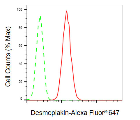 Flow cytometric analysis of desmoplakin expression in HepG2 cells using desmoplakin antibody. Green, isotype control; red, desmoplakin.