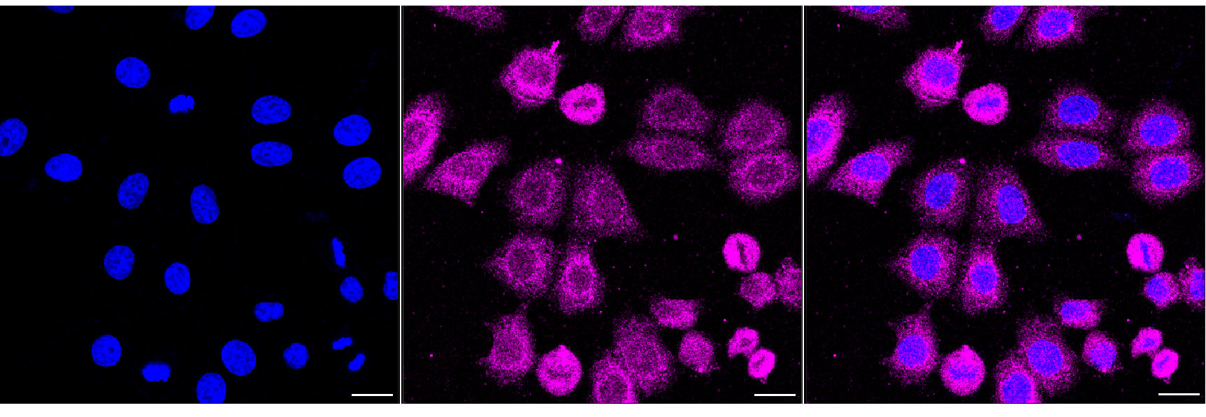 Immunocytochemical staining of HepG2 cells with desmoplakin antibody. Nuclei were stained blue with DAPI; Desmoplakin was stained magenta with Alexa Fluor? 647. Images were taken using Leica stellaris 5. Protein abundance based on laser Intensity and smart gain: Low. Scale bar, 20 μm.