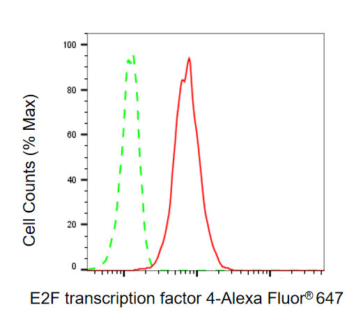 Flow cytometric analysis of E2F transcription factor 4 expression in HAP-1 cells using E2F transcription factor 4 antibody. Green, isotype control; red, E2F transcription factor 4.