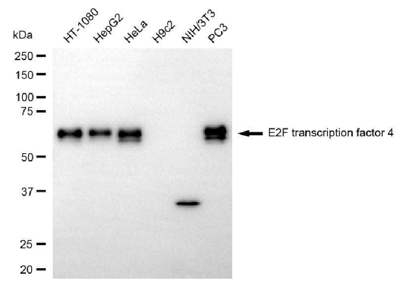 Western blotting analysis using E2F transcription factor 4 antibody. Total cell lysates (30 μg) from various cell lines were loaded and separated by SDS-PAGE. The blot was incubated with E2F transcription factor 4 antibody and HRP-conjugated goat anti-rabbit secondary antibody respectively.