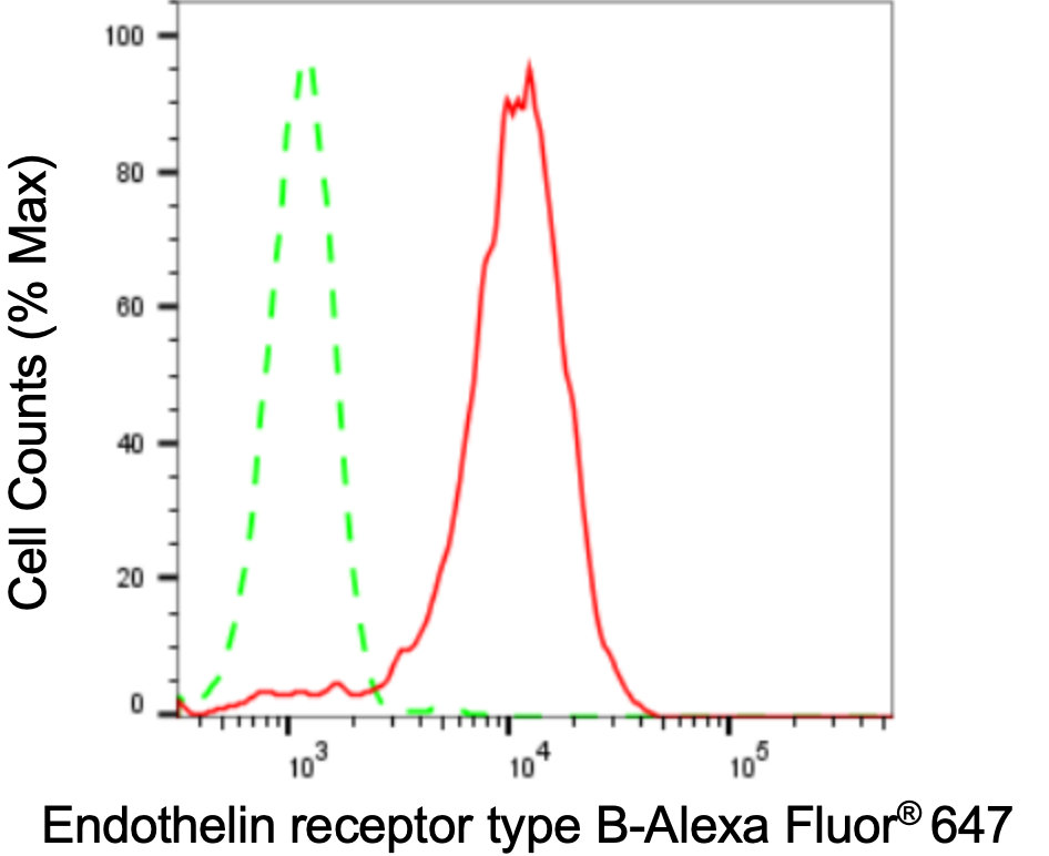 Flow cytometric analysis of Endothelin receptor type B expression in HepG2 cells using Endothelin receptor type B antibody. Green, isotype control; red, Endothelin receptor type B.